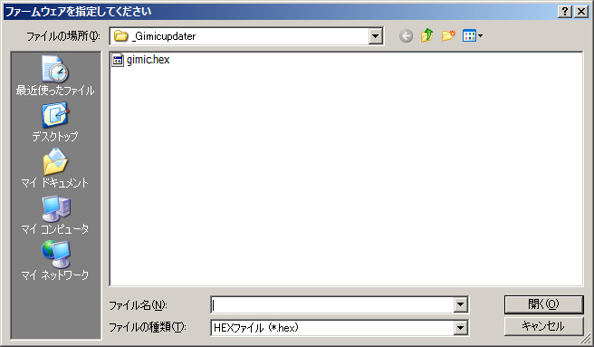 (ここで先ほどGimicUpdaterのフォルダに入れたhexファイルを選択します)