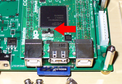 ①GIMICからUSBケーブルを外して電源を落とし、CPU基板上にある黒いスイッチを右から左にスライドして下さい(以下の画像の赤矢印の物)