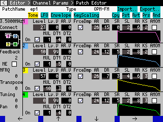 右側に別のオペレーターが接続されているオペレーターは「モジュレーター」と呼ばれ、次のオペレーターを変調をする役割を持ちます。経路の終端となっているオペレーターは、「キャリア」と呼ばれ、変調をされる側になります。「モジュレーター」の出力レベルは変調の強さであり、「キャリア」の出力レベルは音量を意味します。どのアルゴリズムでも、4つのうち1つだけ出力を自分自身に戻す経路を持つオペレーターがあります。これは「フィードバック」と呼ばれ、自分自身を変調する特別なオペレーターです。これを深く掛けていくと次第に倍音が増え、オペレーターの波形はノコギリ波に近づいていき、最終的にはノイズになります。これにより、あたかもオペレータが4つよりも多くあるかのような豊かな倍音を持った音色も生み出す事ができます。ところで、キャリアにフィードバックが付いているアルゴリズムがありますが、これには若干注意が必要です。MIDI経由では、ノートオンベロシティや、ボリューム、エクスプレッション等、音量をコントロールする要因が数多くあります。これらは内部ではキャリアのTotal Levelをコントロールする事によって音量を変化させています。そのため、キャリアにフィードバックが付いているアルゴリズムの場合、音量の変化によって音色が変化する場合がある事を留意ください。