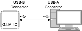 GIMICのUSB-B端子とPCを接続すると、GIMICはUSB-MIDI機器として認識されます。OSの標準ドライバで動作し、GIMICを音源モジュールとして利用できます。