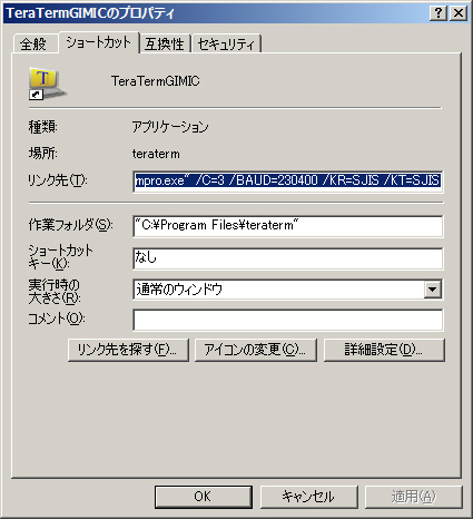 ショートカットのオプションを開き、リンク先の欄の末尾に「 /C=3 /BAUD=230400 /KR=SJIS /KT=SJIS」を追加して下さい。