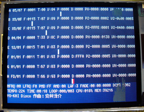 PMD再生時は曲のタイトルと編曲者及び鍵盤表示が行われます。