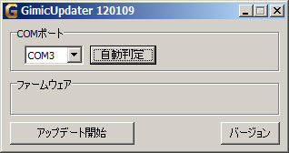 ④GimicUpdater.exeを実行します。以下の画面が表示されます。GIMICをPCに接続していることを確認し、自動判定ボタンを押して下さい。