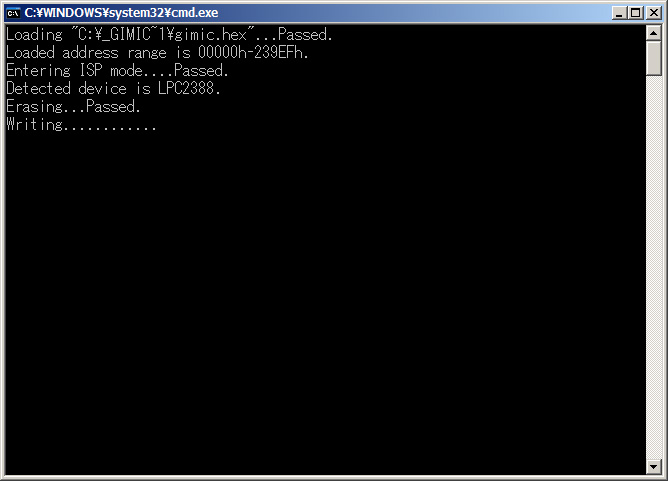 ⑩ファームの書き込みが終わると「Writing...(略)...Passed.」と表示されます。何かキーを押して下さい。この黒背景のウインドウが消えます。