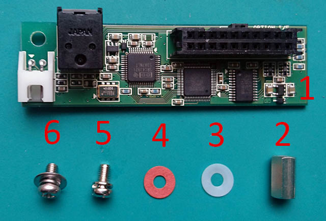 1.モジュールを取り外し、モジュール裏から六角スペーサーを紙ワッシャーとセムスネジ(ワッシャx1タイプ)