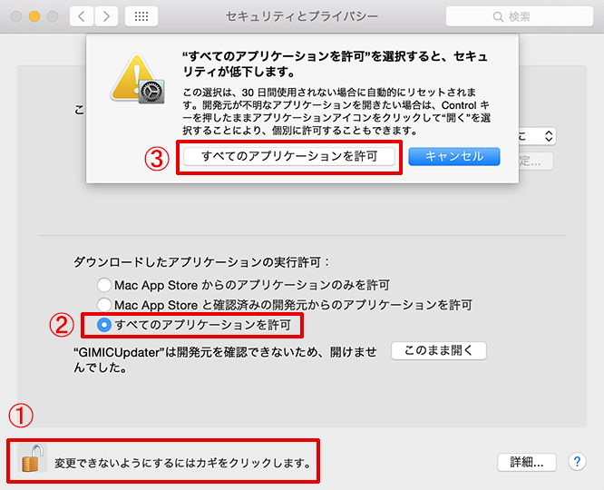 ※macOS Sierra(10.12)以降では「セキュリティーとプライバシー」からの許可設定は出来なくなりました。