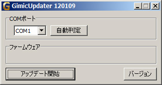 ④GimicUpdater.exeを実行します。以下の画面が表示されます。GIMICをPCに接続していることを確認し、自動判定ボタンを押して下さい。