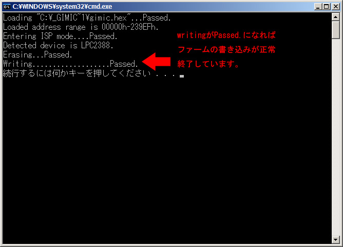⑩ファームの書き込みが終わると「Writing...(略)...Passed.」と表示されます。何かキーを押して下さい。この黒背景のウインドウが消えます。