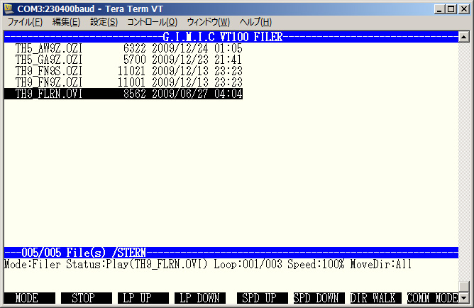 ⑥SDカードに入っている曲データが以下のようにTeraTermに表示されます。